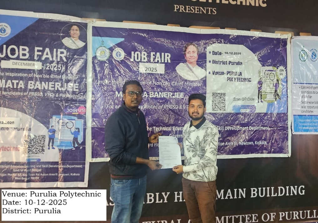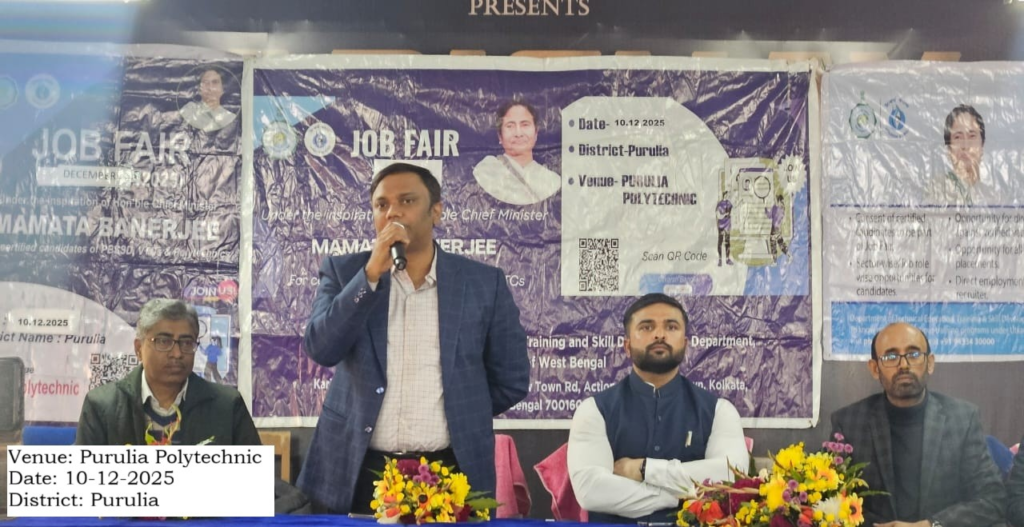 নিজস্ব সংবাদদাতা, পুরুলিয়া :১০ ডিসেম্বর, ২০২৫ পুরুলিয়া পলিটেকনিক কলেজে কারিগরি শিক্ষা প্রশিক্ষণ ও দক্ষতা উন্নয়ন বিভাগের অধীনে উৎকর্ষ বাংলা-পুরুলিয়া কর্তৃক একটি চাকরি মেলার আয়োজন করা হয়েছিল। জেলা শাসক কোন্থাম সুধীর, IAS, অতিরিক্ত জেলাশাসক ভূমি ও ভূমি সংস্কার পাটিল যোগেশ অশোকরাও, IAS, পি.বি.এস.এস.ডি-এর জেলা নোডাল অফিসার এবং পুরুলিয়া পলিটেকনিকের ভারপ্রাপ্ত অধ্যক্ষের উপস্থিতিতে এই কর্মসূচির উদ্বোধন করা হয়। বিভিন্ন ক্ষেত্রের ১১টি স্বনামধন্য কোম্পানির প্রতিনিধিরা চাকরিপ্রার্থীদের চাকরি প্রদানের জন্য এই অনুষ্ঠানে অংশগ্রহণ করেছিলেন। ৩৫০ জনেরও বেশি চাকরিপ্রার্থী এই চাকরি মেলায় অংশগ্রহণ করেছিলেন। ১০২ জন সফল প্রার্থীদের চাকরির নিয়োগপত্র প্রদান করা হয়েছে চাকরি মেলা থেকে।