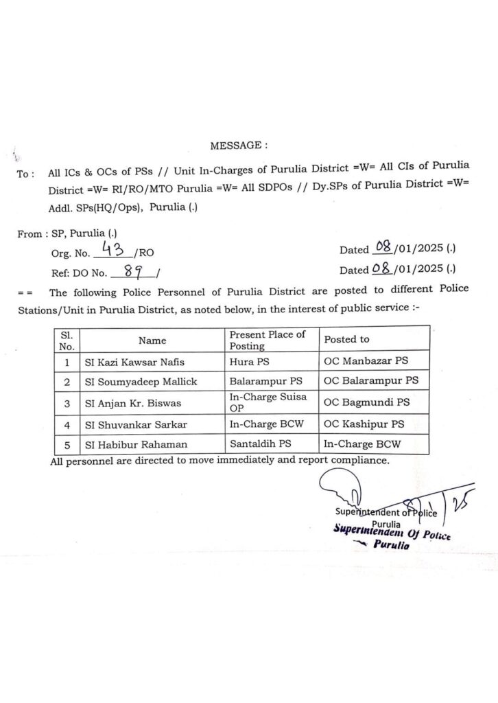 নিজস্ব সংবাদদাতা, পুরুলিয়া, ৮ জানুয়ারি ২০২৫, বুধবারঃ পুরুলিয়া জেলা পুলিশে রদবদল। আজ, বুধবারই জেলা পুলিশ সুপার অভিজিৎ বন্দ্যোপাধ্যায় একটি নির্দেশিকা জারি করে এই রদবদলের বিষয়ে জানানোর পাশাপাশি অবিলম্বে সংশ্লিষ্ট পুলিশ অধিকারিকদের নতুন দায়িত্বভার গ্রহন করতে নির্দেশ দিয়েছেন বলে জেলা পুলিশ সূত্রে খবর। জানা গিয়েছে, হুড়া থানার এস আই কাজি কওশার নাফিস কে মানবাজার থানার ওসি হিসেবে বদলির পাশাপাশি বলরামপুর থানার সেকেন্ড অফিসার সৌম্যদীপ মল্লিককে বলরামপুর থানাতেই ওসি হিসেবে দায়িত্ব দেওয়া হয়েছে। এছাড়া সুইসা আউটপোস্টের দায়িত্বপ্রাপ্ত এস আই অঞ্জন কুমার বিশ্বাসকে ওসি বাঘমুন্ডি এবং এস আই শুভঙ্কর সরকার (ইনচার্জ, বি সি ডব্লিউ)-কে ওসি কাশীপুরের দায়িত্ব দেওয়া হয়েছে। সাঁওতালডি থানার এস আই হাবিবুর রহমানকে দায়িত্ব দেওয়া হল ইনচার্জ, বি সি ডব্লিউ-এর। জেলা পুলিশ সূত্রে খবর এটা দপ্তরের রুটিন বদলির প্রক্রিয়া।