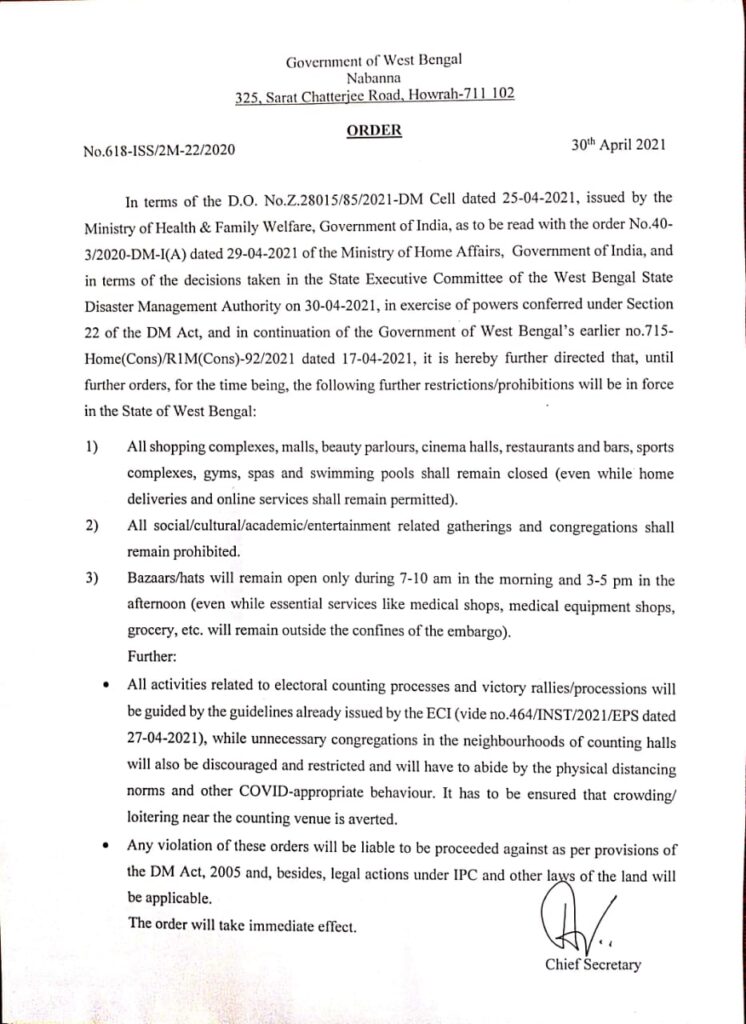 নির্দেশিকায় উল্লেখ, শপিং মল, সিনেমা হল, রেস্টুরেন্টের মত জনবহুল স্থানগুলি সহ জিম, স্পা, সুইমিং পুল, স্পোর্টস মিট ইত্যাদি সম্পূর্ণ বন্ধ রাখা হবে। তবে খাদ্য দ্রব্যের হোম ডেলিভারি খোলা থাকছে। বাজার হাট খোলা থাকবে সকাল ৭ টা থেকে ১০ টা এবং বিকেল ৩ টে থেকে ৫ টা পর্যন্ত। ওষুধ পত্র ও গ্রোসারি দ্রব্যের মত অত্যাবশ্যকীয় কাউন্টারগুলিকে অবশ্য বন্ধের আওতার বাইরে রাখা হয়েছে। যে কোন রকম সামাজিক, সাংস্কৃতিক, শিক্ষা সম্বন্ধীয় জমায়েত সম্পূর্ণ বন্ধ রাখার নির্দেশ দেওয়া হয়েছে সরকারি নির্দেশিকায়। এমনকি কোভিড বিধি ভঙ্গে কড়া পদক্ষেপ নেওয়ার বিষয়েও নির্দেশিকায় উল্লেখ।