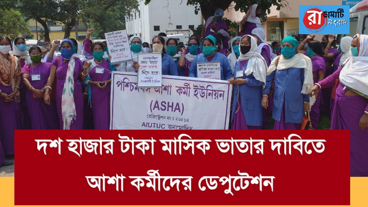 পশ্চিমবঙ্গ আশা কর্মী ইউনিয়নের পুরুলিয়া জেলা কমিটির সদস্যরা মঙ্গলবার দশ হাজার টাকা মাসিক ভাতার দাবি সহ একগুচ্ছ দাবি সম্বলিত দাবিসনদ দিলেন পুরুলিয়ার জেলা মুখ্য স্বাস্থ্য আধিকারিকের কাছে। এদিন দুপুর ১২ টা নাগাদ সংগঠনের আশা কর্মীরা শহরের রাঁচি রোডের সি এম ও এইচ দপ্তরের সামনে জমায়েত হয়ে তাঁদের দাবিগুলির উল্লেখ করে প্রথমে স্লোগান সহ বিক্ষোভ দেখান। পরে দাবিসনদ পেশ করা হয় বলে জানিয়েছেন সদস্যরা।