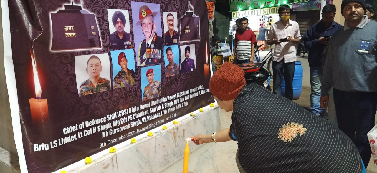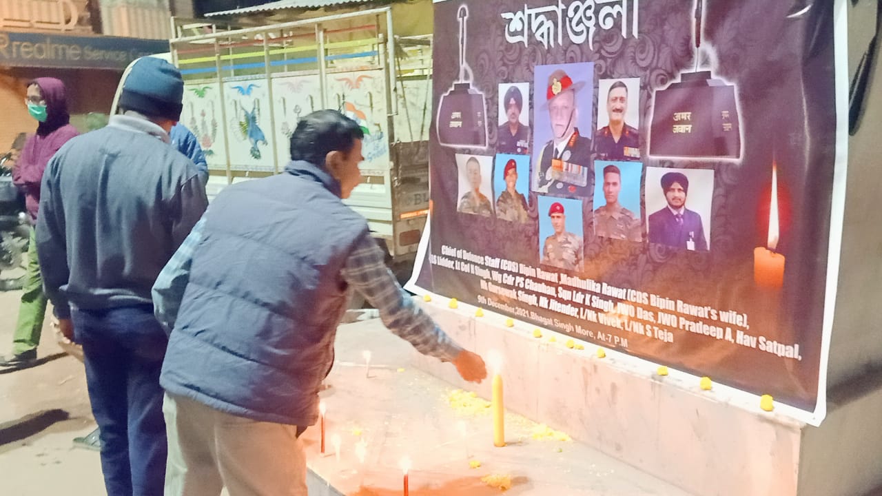 হেলিকপ্টার দূর্ঘটনায় নিহত সেনা সর্বাধিনায়ক বিপন রাওয়াত এর মৃত্যু তে শোকস্তব্ধ গোটা দেশ। কুন্নুর এ এই দুর্ঘটনায় সেনা সর্বাধিনায়ক এর সাথে তাঁর স্ত্রী এবং ১১জন সহকর্মী নিহত হয়েছেন। প্রয়াত সৈনিকদের স্মৃতির প্রতি শ্রদ্ধা জানিয়ে আজ পুরুলিয়া শহরের ভগৎ সিং মুর্তির পাদদেশে শোকপালন করলো টীম উপহার। এই স্বেচ্ছাসেবী সংস্থার সদস্যরা ছাড়াও স্হানীয় মানুষজন ও পথচলতি নাগরিকেরা মোমবাতি জ্বালিয়ে এবং পুষ্পার্ঘ্য অর্পণ করে নিহত সেনা কর্মী দের শেষ শ্রদ্ধা জানান