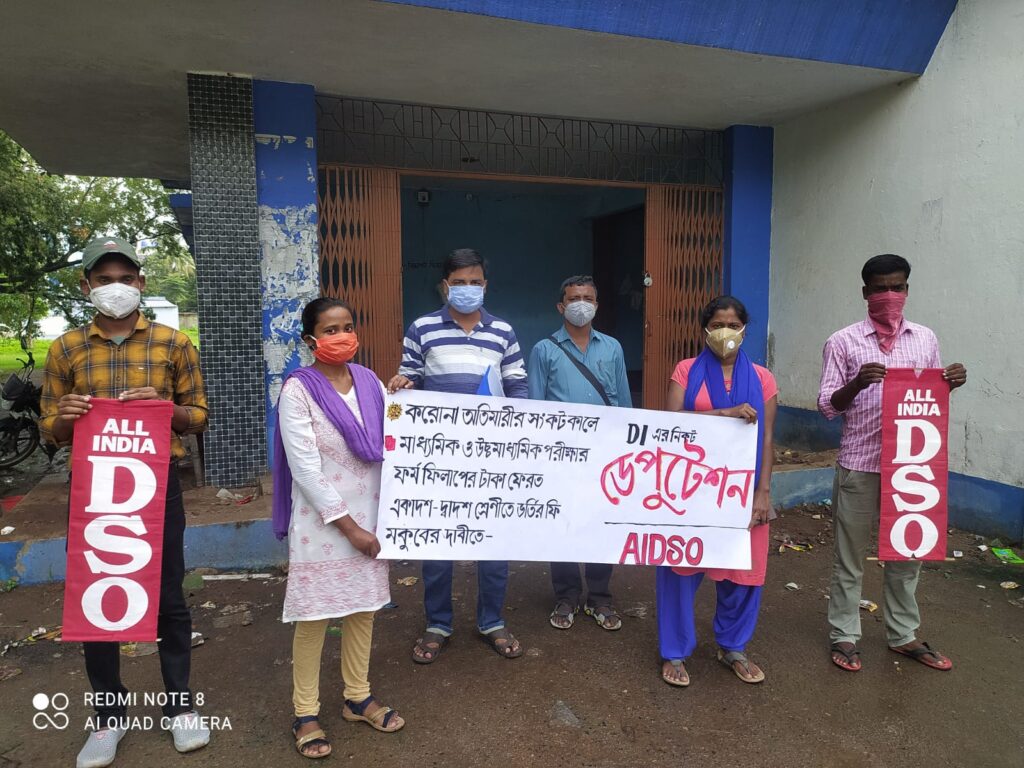 মাধ্যমিক ও উচ্চ মাধ্যমিক এর ফরম ফিলাপের টাকা ফেরতের দাবিতে ডিআই সেকেন্ডারির কাছে ডেপুটেশন দিল ছাত্র সংগঠন এ আই ডি এস ও। আজ বুধবার সংগঠনের কয়েকজন নেতাকর্মী মিলে ডি আই অফিস চত্বরে জড়ো হয় এবং স্লোগান দিতে থাকে। তারপর পাঁচজনের প্রতিনিধি দল তারা ডি আই এর কাছে যান এবং ডেপুটেশন দেন। এই প্রতিনিধি দলের সদস্য এবং সংগঠনের জেলা সম্পাদক বিকাশ রঞ্জন কুমার বলেন, যে যেহেতু রাজ্য সরকার মাধ্যমিক এবং উচ্চ মাধ্যমিক পরীক্ষা বাতিল করেছে তাই ফরম ফিলাপের টাকা অবিলম্বে ছাত্র-ছাত্রীদের ফেরত দিতে হবে এবং করোনা অতি মারির কারণে সাধারণ মানুষের রোজগার বন্ধ, তাই একাদশ এবং দ্বাদশ শ্রেণিতে ভর্তির ক্ষেত্রে সমস্ত ধরনের ফি মকুব করতে হবে। ডেপুটেশনে উপস্থিত ছিলেন সংগঠনের জেলা সভাপতি কমরেড স্বপন প্রামানিক।