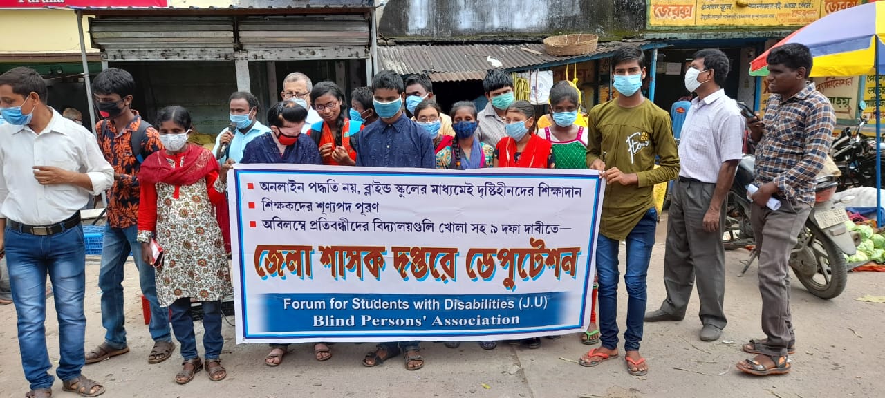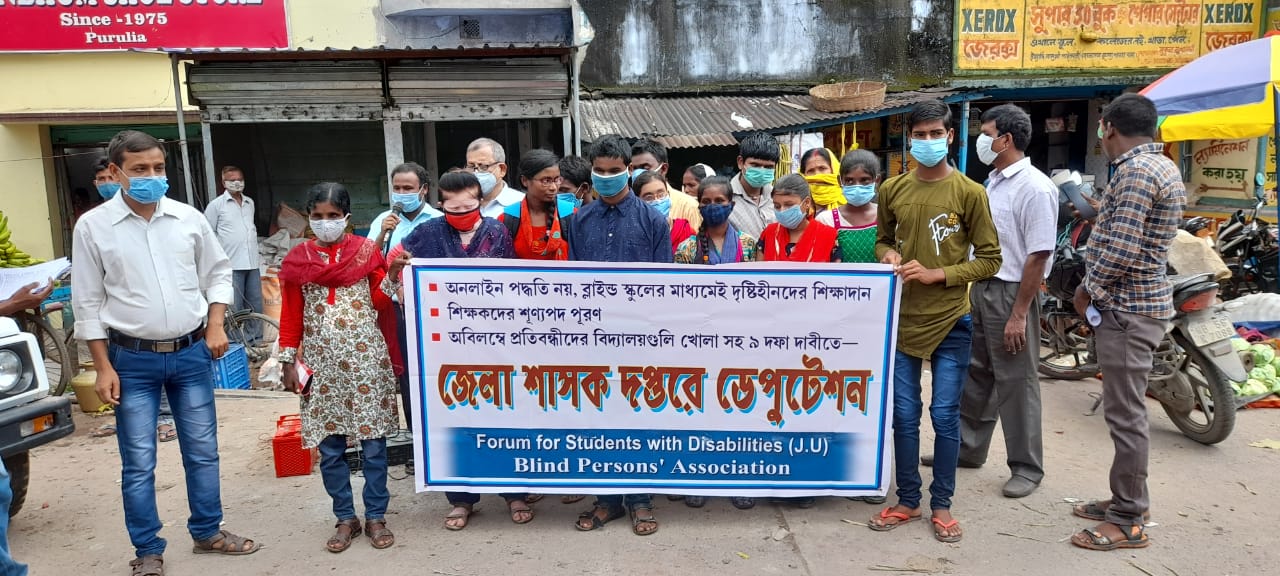 প্রতিবন্ধী শিক্ষার্থীদের জেলা ফোরামের পক্ষ থেকে আজ পুরুলিয়া জেলা শাসকের দপ্তরে দাবিসনদ পেশ করা হল। প্রতিবন্ধী শিক্ষার্থী ফোরামের ব্লাইন্ড পার্সনস অ্যাসোসিয়েশন এদিন জেলার প্রতিবন্ধীদের বিদ্যালয়গুলি অবিলম্বে খোলা, অনলাইন পদ্ধতিতে নয়, অবিলম্বে দৃষ্টিহীন প্রতিবন্ধীদের ব্লাইন্ড স্কুলের মাধ্যমেই শিক্ষাদানের ব্যবস্থা করা, প্রতিবন্ধীদের বিদ্যালয়গুলিতে শূণ্য শিক্ষক পদে অবিলম্বে পূরণ করার ব্যবস্থা করা সহ প্রায় ৯ দফা দাবিসনদ এদিন জেলা শাসকের দপ্তরে পেশ করে।