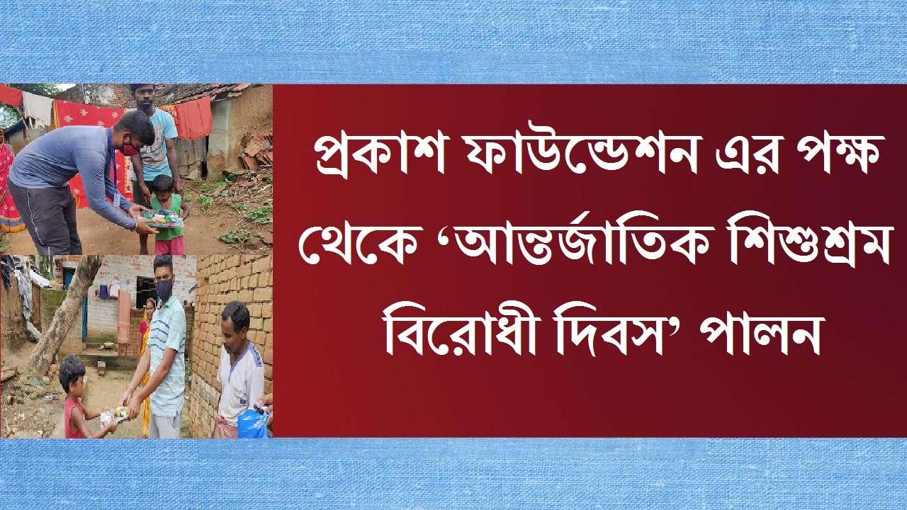 শিশুশ্রম বন্ধ করতে, শিশুদের অধিকার নিশ্চিত করতে নানা দেশে আইন তৈরি হয়েছে। আমাদের দেশও ব্যতিক্রম নয়। তবুও আমাদের দেশে আজও শিশু শ্রমিকের সংখ্যা প্রায় এক কোটিরও বেশি। এই শিশু শ্রমিকদের কথা আরও এক বার আলোচনায় উঠে আসে আজকের দিনটিতে। কারণ আজ, ১২ জুন দিনটি সমগ্র বিশ্বজুড়ে ‘আন্তর্জাতিক শিশুশ্রম বিরোধী দিবস’ হিসেবে পালিত হয়ে থাকে তাই আজ কেন্দা থানার অন্তর্গত রাজনোয়াগড় গ্ৰামে কিছু ছেলে মেয়েদেরকে বস্ত্র ও বিস্কুট, ডেটল সাবান, ইত্যাদি বিতরণ করা হল এবং এবং শিশুশ্রম বিরোধী সম্পর্কে সচেতনতার প্রচার করা হলো প্রকাশ ফাউন্ডেশন পুরুলিয়া ইউনিট থেকে।প্রকাশ ফাউন্ডেশন এর পক্ষ থেকে সভাপতি দীপক কুমার মাহাতো জানান,আজ শিশুশ্রম বিরোধী দিবস কে সামনে রেখে রাজনোয়াগড় গ্রামের কুড়িটি দুঃস্হ শিশুদের পরিবারের হাতে নতুন বস্ত্র ও খাদ্য সামগ্রী তুলে দেওয়া হয় আগামী দিনেও এরকম প্রচেষ্টা প্রকাশ ফাউন্ডেশন এর পক্ষ থেকে চলতে থাকবে।
