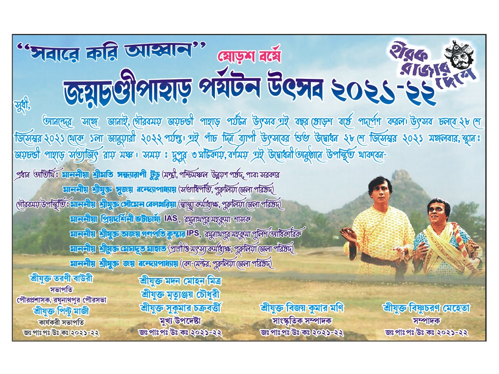 মঙ্গলবার জয়চন্ডী পাহাড় পর্যটন উৎসবের সূচনা করলেন পশ্চিমাঞ্চল উন্নয়ন মন্ত্রী সন্ধ্যারানি টুডু। এছাড়াও উপস্থিত ছিলেন পুরুলিয়া জেলা পরিষদের সভাধিপতি সুজয় বন্দ্যোপাধ্যায় সহ ব্লক ও মহকুমা প্রশাসনের আধিকারিকেরা। মেলা চলবে ১ জানুয়ারি পর্যন্ত। মেলা কমিটি সূত্রে আরও জানাগিয়েছে, বিভিন্ন সরকারি স্টলের পাশাপাশি প্রতিদিনই সন্ধ্যায় সাংস্কৃতিক অনুষ্ঠানও হবে মেলা প্রাঙ্গনে।
