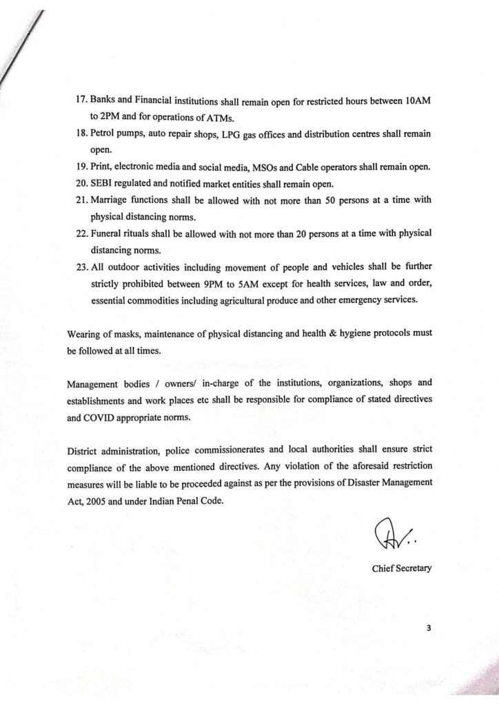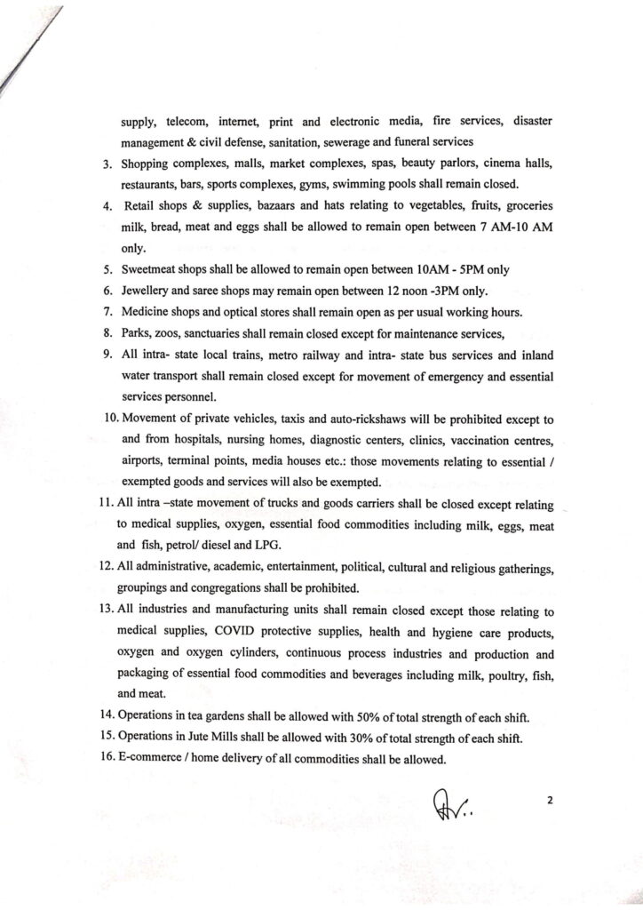 ২. স্বাস্থ্যসেবা, পশুচিকিত্সা পরিষেবা, আইনশৃঙ্খলা, আদালত, সমাজকল্যাণমূলক গৃহ, সংশোধনী সেবা, বিদ্যুৎ, পানীয় জলের সরবরাহ, টেলিকম, ইন্টারনেট, প্রিন্ট এবং ইলেকট্রনিক মিডিয়া, ফায়ার সার্ভিসেস, দুর্যোগ পরিচালনা ও নাগরিক প্রতিরক্ষা, স্যানিটেশন, নর্দমা ব্যবস্থা এবং শেষকৃত্যের পরিষেবার মতো জরুরি ও প্রয়োজনীয় পরিষেবা সম্পর্কিত ব্যতীত সকল সরকারি অফিস এবং বেসরকারী প্রতিষ্ঠান বন্ধ থাকবে।