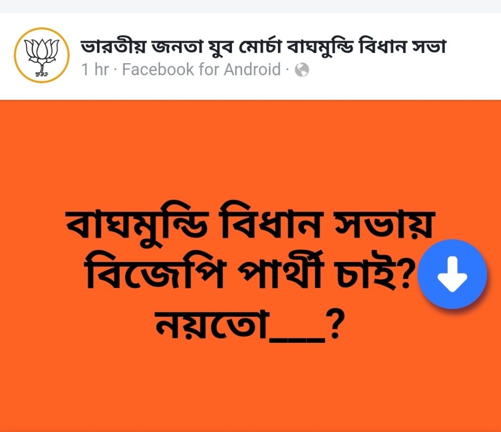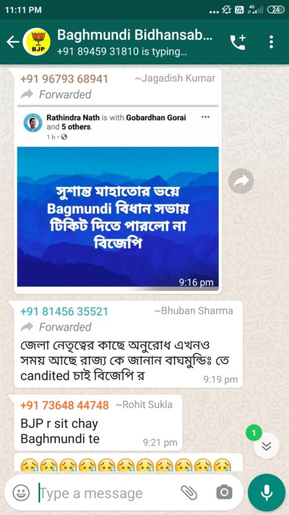 বাঘমুন্ডি বিধানসভায় বিজেপি নিজের প্রতীকে না লড়লে দলীয় সমর্থকদের একাংশ যে ভোটে অংশগ্রহন করছে না, হুমকি তেমনও দেওয়া হয়েছে। এমনকি কবিতার ছন্দে কর্মীদেরই কেউ কেউ বিদ্রুপ করে সোশ্যাল মিডিয়ায় লিখছেন ‘বিজেপি-র পচা কলা /ভোট দিতে গায়ে জ্বালা’। বিধানসভা এলাকার যুব মোর্চার বিভিন্ন গ্রুপে তো বিজেপির সিদ্ধান্তের বিরুদ্ধে সরাসরি হুমকি দিয়ে লেখা হয়েছে, ‘বিজেপি-র প্রতীকে প্রার্থী চাই, নয়তো…’। অর্থাৎ দলীয় প্রতীকে প্রার্থী না হলে বিধানসভায় বিজেপি যে চরম বিপাকে পড়তে পারে, ইঙ্গিত তেমনই।