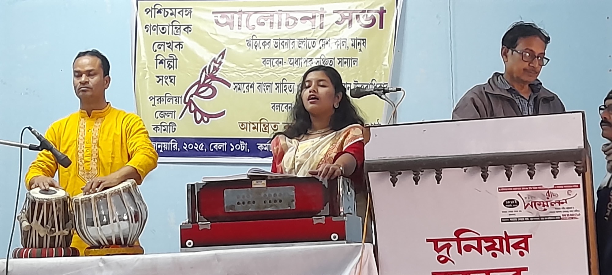 নিজস্ব সংবাদদাতা, পুরুলিয়া, ২৪ জানুয়ারি ২০২৫, শুক্রবারঃ বাংলা সাহিত্য ও বাংলা চলচ্চিত্র জগতের দুই প্রবাদ প্রতীম দিকপাল সমরেশ বসু ও ঋত্বিক ঘটক। এবছর উভয়েরই জন্ম শতবর্ষে পদার্পণ করল। বৃহস্পতিবার, (২৩ জানুয়ারি) পশ্চিমবঙ্গ গণতান্ত্রিক লেখক শিল্পী সংঘ, পুরুলিয়া জেলা কমিটি তাই তাঁদের স্মরণে একটি মনোজ্ঞ সাংস্কৃতিক অনুষ্ঠানের আয়োজন করে। শহরের কর্মচারী ভবনে দুই দিকপালের সৃষ্টিশৈলী, তাঁদের ভাবাদর্শে দেশ, কাল মানুষ সহ তাঁদের সৃষ্ট শিল্পের বিভিন্ন দিক নিয়ে একটি আলোচনা সভার আয়োজনের পাশাপাশি জেলা তথা জেলার বাইরের কবিদের নিয়ে কবিতা পাঠের অনুষ্ঠান হয়। সমরেশ বসু ও ঋত্বিক ঘটক এবং তাঁদের শিল্প নিয়ে এদিন আলোচনা করেন শৌভিক উপাধ্যায় ও ড. সঞ্চিতা সান্যাল । কবিতা পাঠের আসরের সভাপতিত্ব করেন জেলার বিশিষ্ট দুই সাহিত্যিক সৈকত রক্ষিত ও অশোক ঘোষ। অংশিকা দত্তের উদ্বোধনী সঙ্গীত ছিল এদিনের অনুষ্ঠানে বাড়তি পাওনা। অনুষ্ঠানের কথামুখ তৈরির পাশাপাশি সার্বিকভাবে অনুষ্ঠানটির সুচারু সঞ্চালনা করেন সংগঠনের জেলা সম্পাদক স্বপন দে। এদিনের অনুষ্ঠানে সভাপতিত্ব করেন সুনীতি গাঁতাইত।