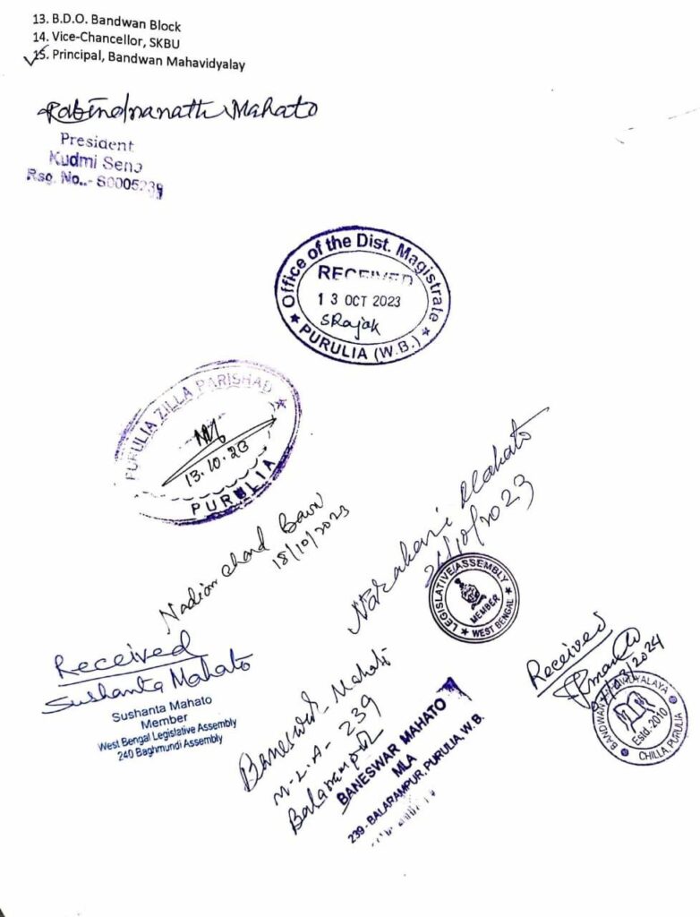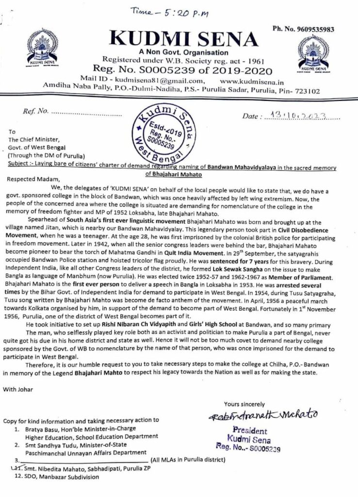 স্বাধীনতা সংগ্রামী তথা তিন বারের সাংসদ ভজহরি মাহাতোর নামে বান্দোয়ান মহাবিদ্যালয় এর নামকরণ ও মেজর সাবজেক্ট হিসাবে কুড়মালি ভাষাতে পঠন-পাঠন এর দাবীতে বান্দোয়ান মহাবিদ্যালয়ে ডেপুটেশন দিল কুড়মি সেনা।