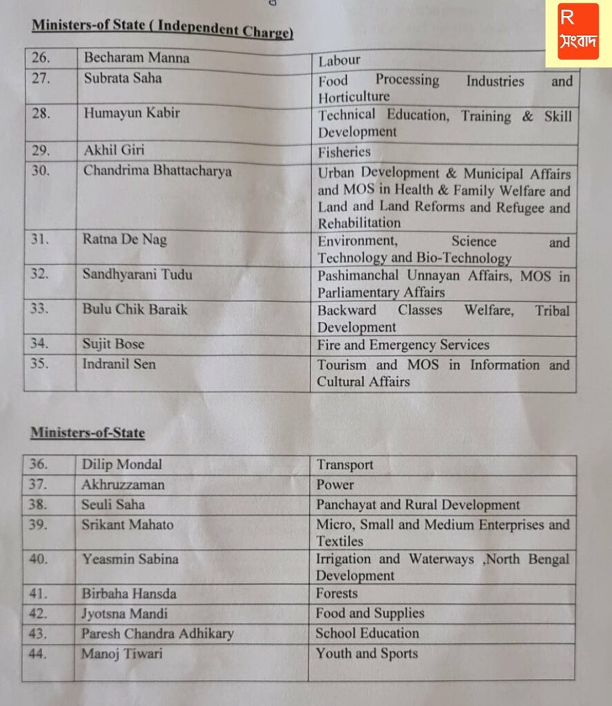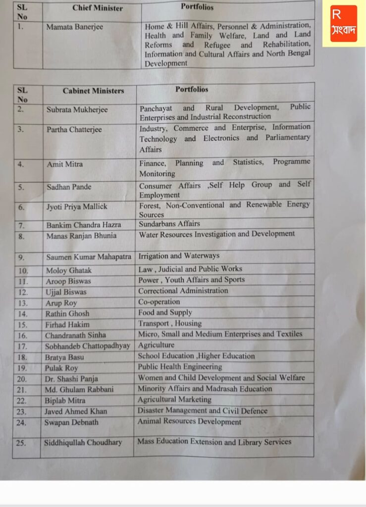 পুরুলিয়া থেকে একমাত্র প্রতিনিধি সন্ধ্যারানি টুডু মহাশয়া রাজ্যের পশ্চিমাঞ্চল উন্নয়ন বিষয়ক দপ্তরের স্বাধীন দায়িত্তপ্রাপ্ত প্রতিমন্ত্রী হিসাবে দায়িত্ত্বভার গ্রহণ করছেন। দেখে নেওয়া যাক অন্যান্যরা কোন কোন মন্ত্রক পেলেন।