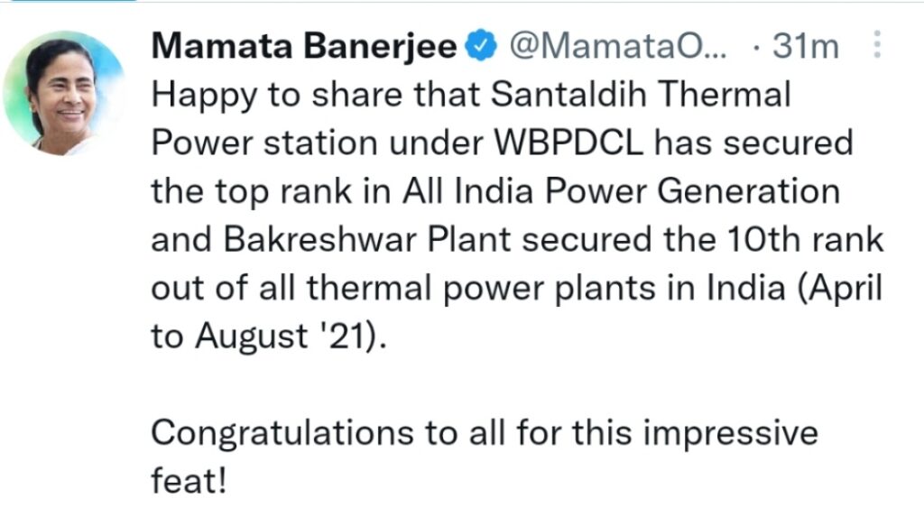চলতি বছরের (২০২১) এপ্রিল থেকে অগাস্ট, এই পাঁচ মাস সাঁওতালডি থার্মাল পাওয়ার স্টেশন বিদ্যুৎ উৎপাদনে প্রথম স্থান অধিকার করল। জানা গিয়েছে তালিকায় দশম স্থানে রয়েছে বক্রেশ্বর থার্মাল পাওয়ার স্টেশন। রাজ্যের মুখ্যমন্ত্রী মমতা বন্দ্যোপাধ্যায় আজ নিজের টুইটারে এই সংবাদ শেয়ার করে এই দুই সংস্থার সকল কর্মীবৃন্দকে অভিনন্দন জানিয়েছেন।