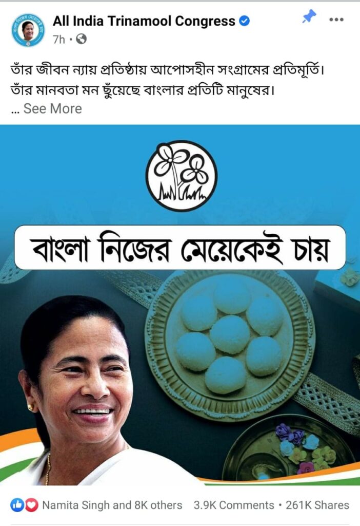বিধানসভা নির্বাচনের লক্ষ্য আজ দুপুরে তৃণমূল কংগ্রেসের নতুন স্লোগান লঞ্চ করা হয় “বাংলা নিজের মেয়েকেই চায়” । ভোট বৈতরণি পার হতে ঘরের মেয়ে আপনজনজন মমতা বন্দ্যোপাধ্যায়ের ভাবমূর্তিকে তুলে ধরে বাঙালি ভোটারদের মন জয়ই লক্ষ্য ।